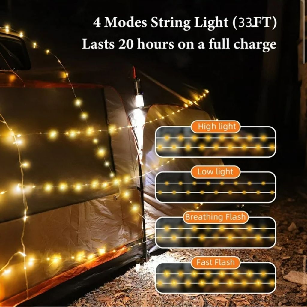 Profitez d’une illumination optimale en extérieur avec cette guirlande lumineuse LED rechargeable. Avec ses 4 modes d'éclairage et une longueur de 10 mètres (33 pieds), elle est idéale pour le camping, les tentes, les soirées en plein air, et les événements en extérieur. Conçue pour être étanche IPX4, elle résiste aux intempéries et garantit une utilisation durable. Facile à transporter, elle fonctionne avec une batterie rechargeable, offrant ainsi une solution d’éclairage pratique et économique pour toutes vos aventures.